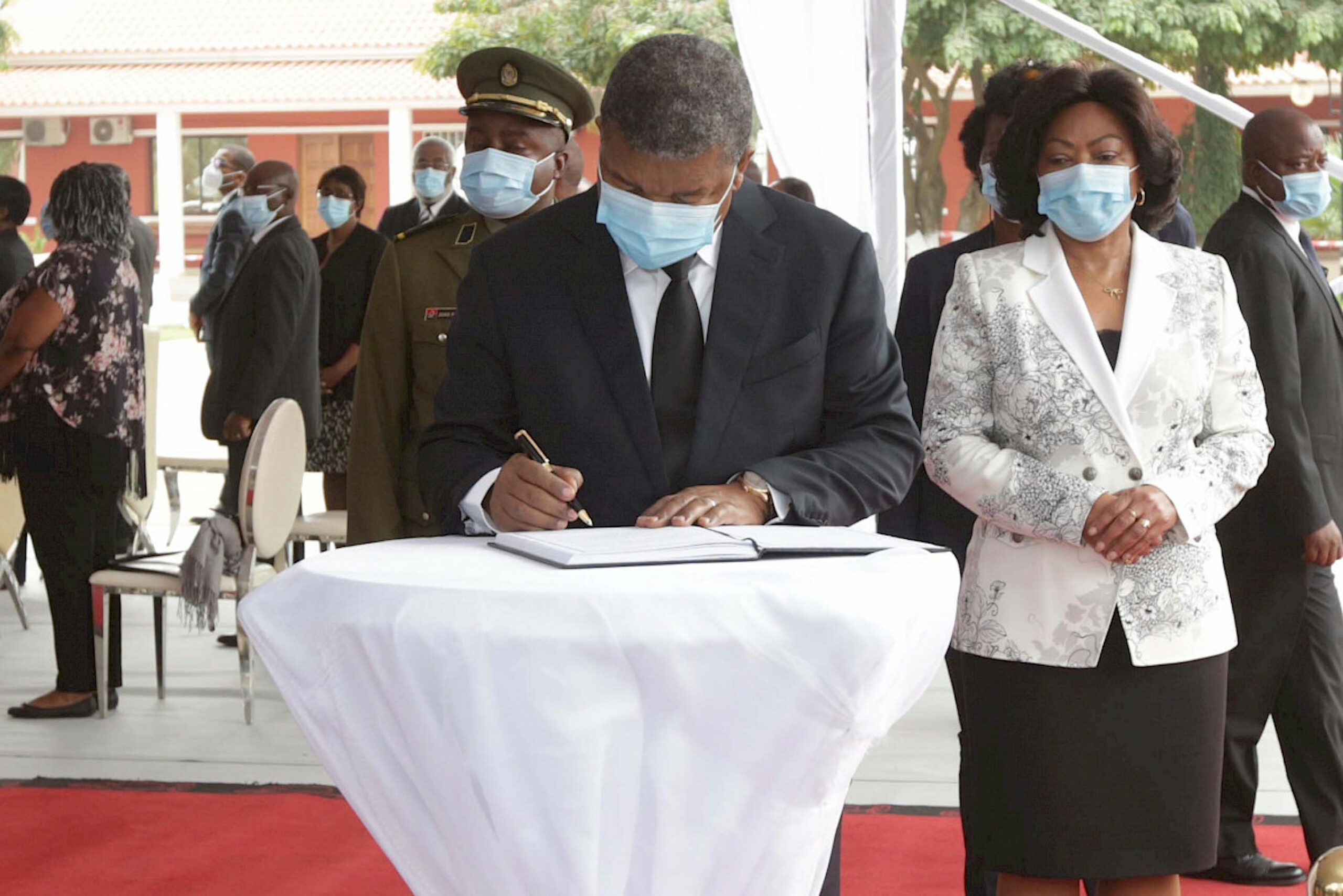 Depois da entoação do Hino Nacional, João Lourenço, que esteve acompanhado da Primeira-Dama, Ana Dias Lourenço, inclinou-se diante da urna contendo os restos mortais do finado dirigente, tendo, de seguida, apresentado condolências à família enlutada.
